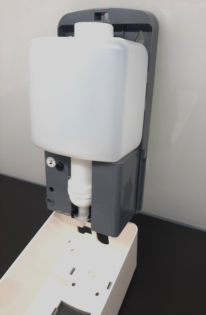 Spender für Schaum, Gel, Flüssig - Tankinhalt 800ml, Abgabe 4ml, Batterien 3 x C-cell für ca. 23. 000 Anwendungen, H x B x T 248 x 116 x 95 mm ( Batterien nicht enthalten)